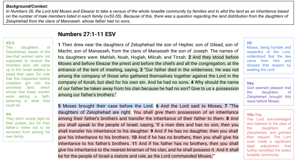 However, Numbers 27:1-11 presents a refreshing counter-narrative. In this passage, the daughters of Zelophehad boldly approach Moses to seek their rightful inheritance. They know the law at the time only allowed sons to inherit land, yet they choose to speak out. Their courage to advocate for themselves reflects a deep faith that God would listen and understand their ask. When they present their case, God not only grants their request but also establishes a new precedent for inheritance rights. This moment illustrates how God genuinely cares for those who earnestly seek Him. He doesn’t see our needs and desires as trivial; they matter deeply to Him.